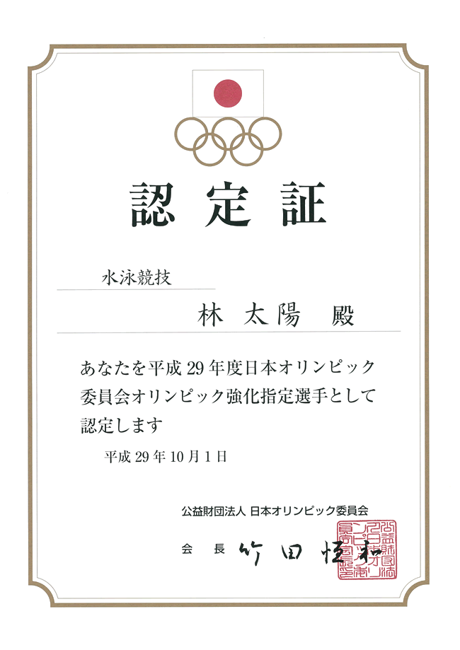 この度、選手クラスの林太陽君が、(公財)日本水泳連盟からの推薦を受け、(公財)日本オリンピック委員会より「平成29年度オリンピック強化指定選手」として認定されました。